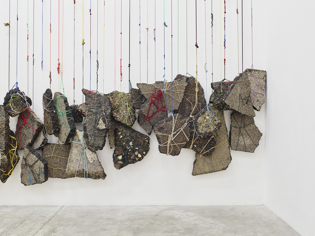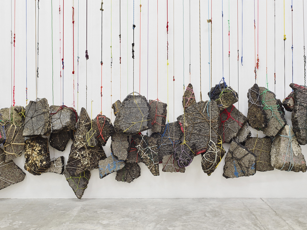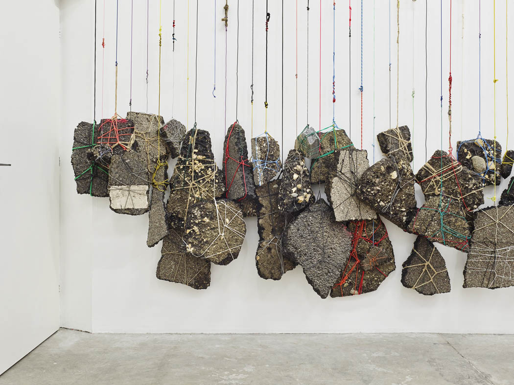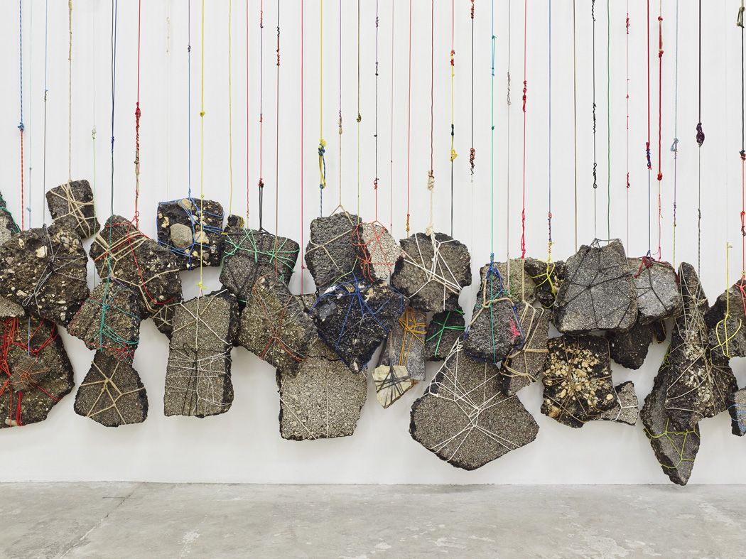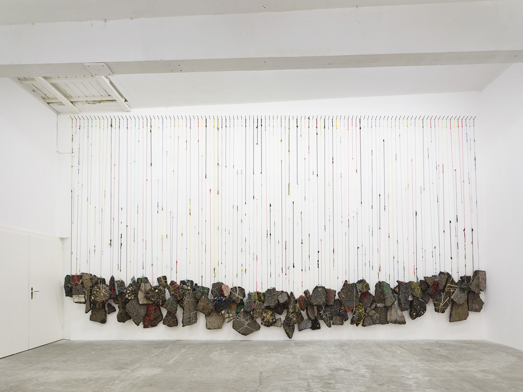 Road asphalt rubble is collected and cleaned. Using ties, string, and electrical wires of all colours, each piece of rubble is tied up on all sides like a packet. All the rubble is hung side by side, at regular intervals, on a wall in the exhibition space. The wires consist of a disparate and colourful mixture of other wires, knotted and tied together. When hung, they form a dense, repetitive vertical grid in the space. A heavy accumulation, a weight distributed along the length of the wall. The installation invites us to see as many bodies and ballasts as there are, each of which could, by extension, be a person. These hundreds of suspended pieces of rubble form a compact mass representing a community of solidarity, but also as many individual entities and torn destinies. The links in EUROPA! EUROPA! underlie accidental rupture, tearing, war.