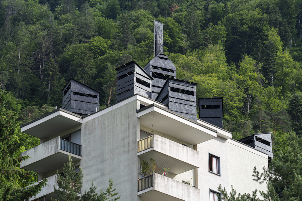Was the space for this colony made available? Was it taken by force? Are its occupants welcomed or held captive? Is the enemy threatening us at our doorstep, or are we showing them our strength? The banners hang over the city. HORST raises questions about hospitality and the need to take up space. Eight wooden huts covered with tar are built on the roof of a residential building in Chur. They are visible from the road, the surrounding hills and the city below. Flags flutter in the wind. HORST is a state, an occupation.