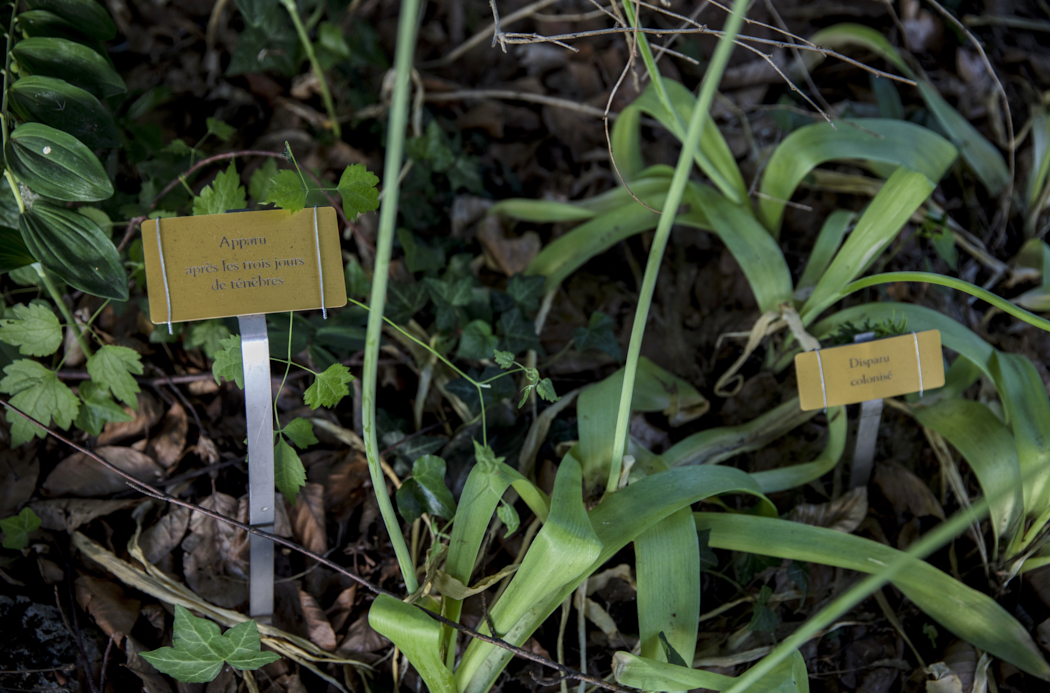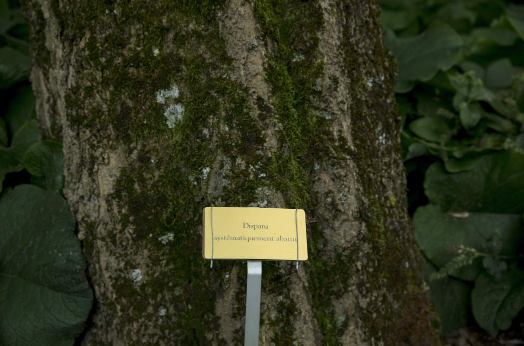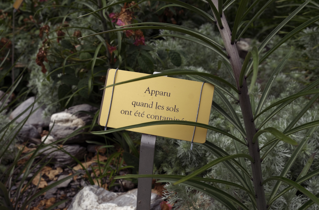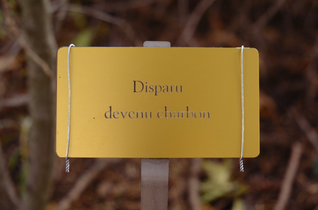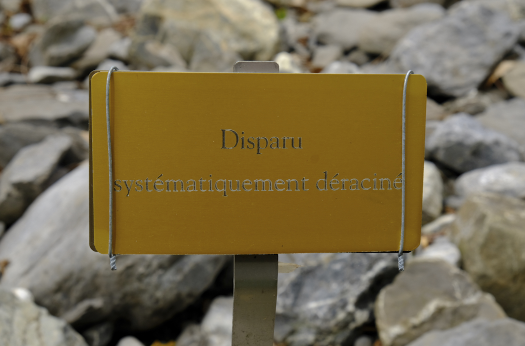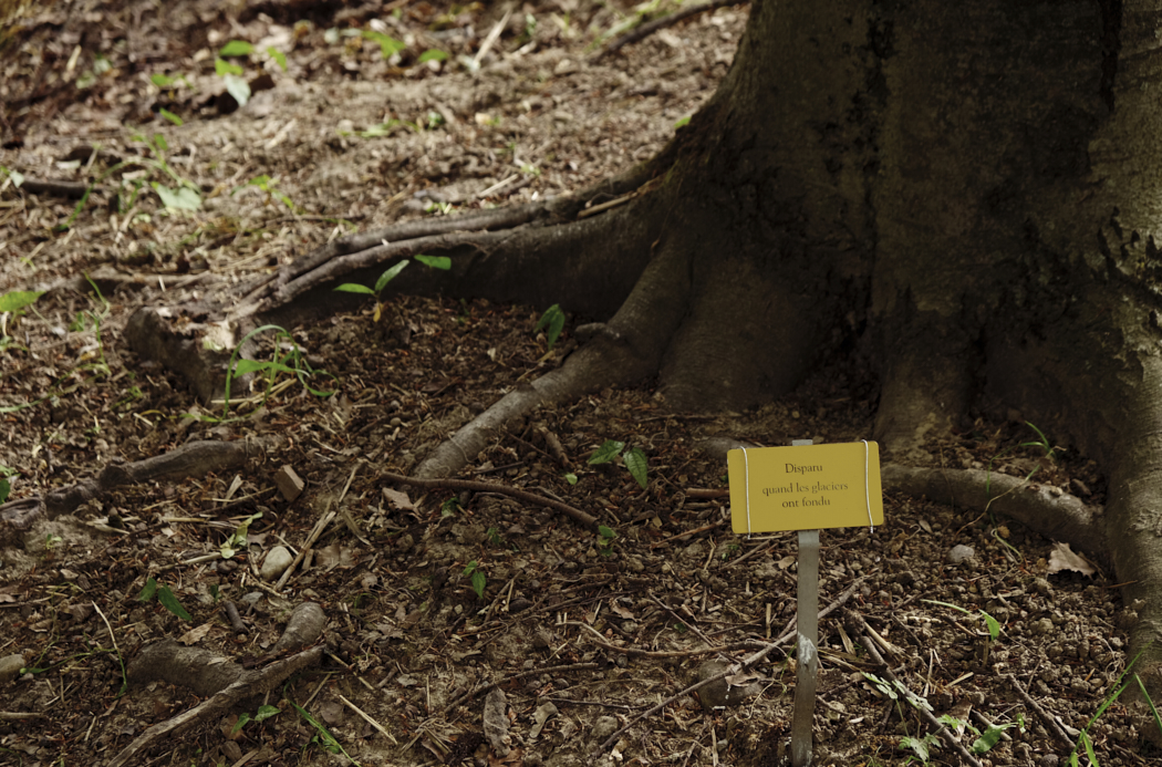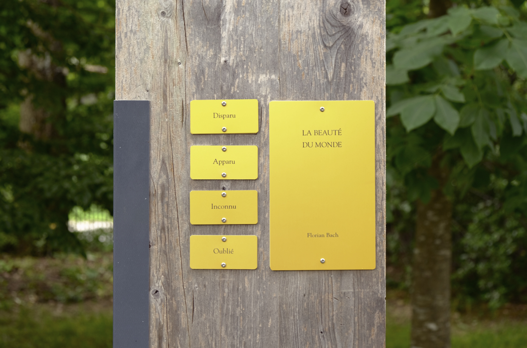 LA BEAUTÉ DU MONDE (The beauty of the world), an intervention on the labelling of the plants all over the botanical garden of the city of Meyrin. The installation tells a catastrophic story and heralds a tragic future. The labels covering the plates identifying the plants refer to the history of mankind and its cycles of destruction in an environmental, health and political context, which is devastated. Projected in a time when ignorance and loss of acquired knowledge is the norm, the visitor turns to the diversity and beauty of trees and plants, priceless gems that need to be protected.