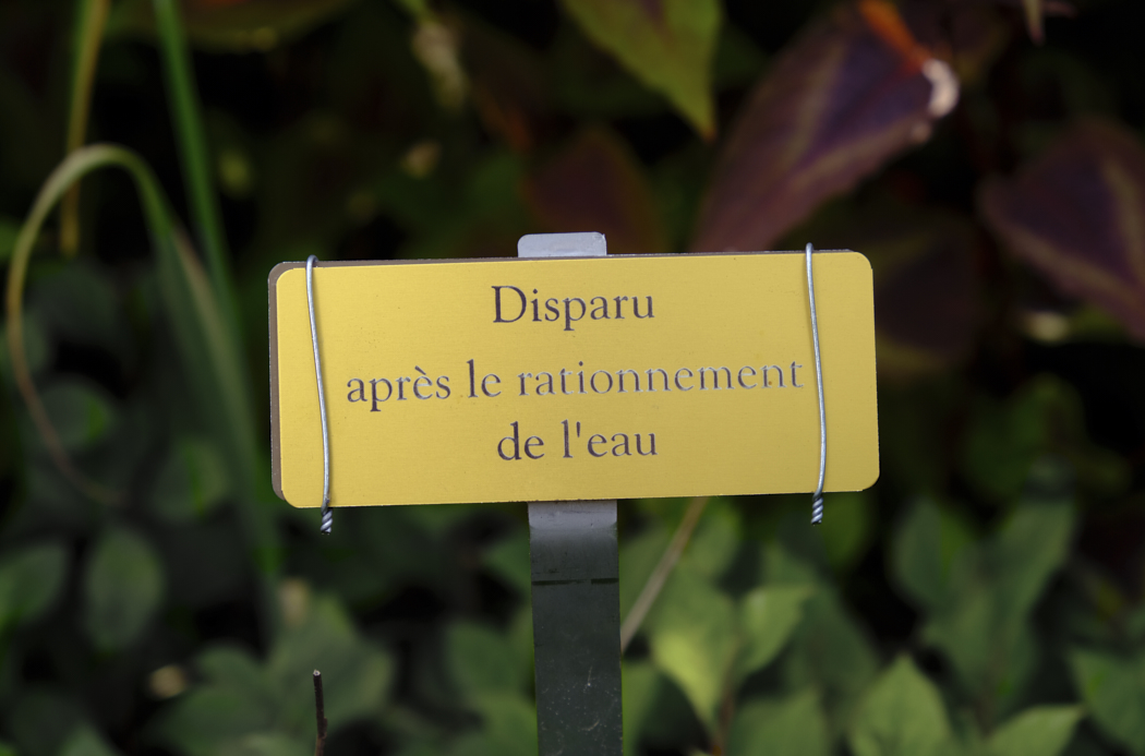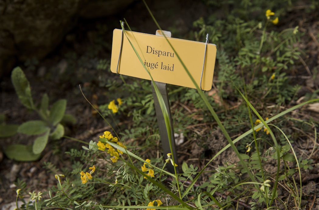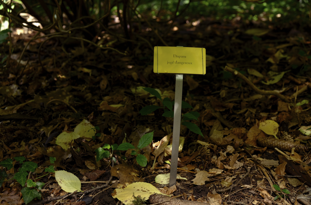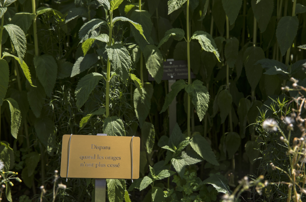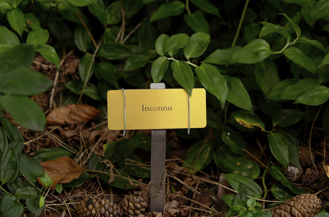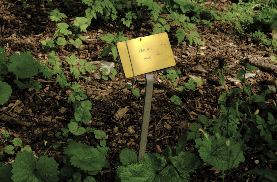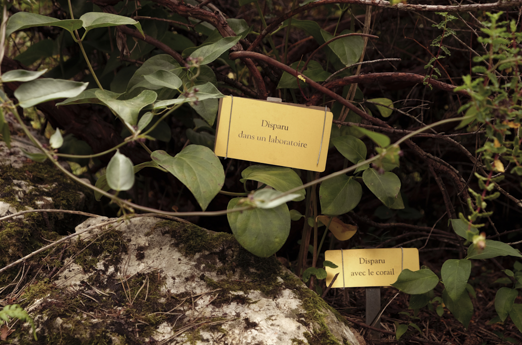 LA BEAUTÉ DU MONDE (The beauty of the world), an intervention on the labelling of the plants all over the botanical garden of the city of Meyrin. The installation tells a catastrophic story and heralds a tragic future. The labels covering the plates identifying the plants refer to the history of mankind and its cycles of destruction in an environmental, health and political context, which is devastated. Projected in a time when ignorance and loss of acquired knowledge is the norm, the visitor turns to the diversity and beauty of trees and plants, priceless gems that need to be protected.