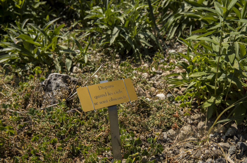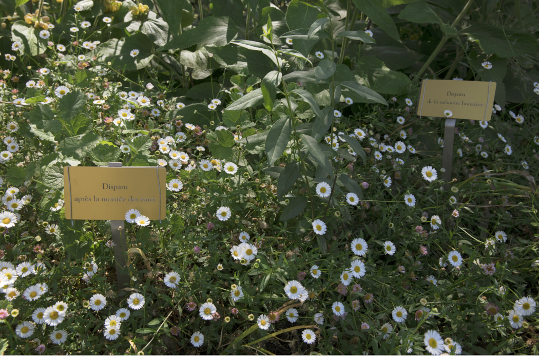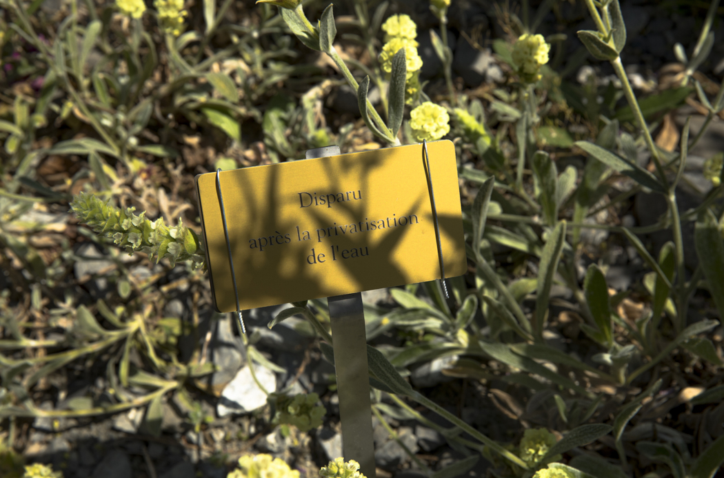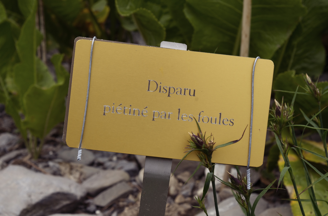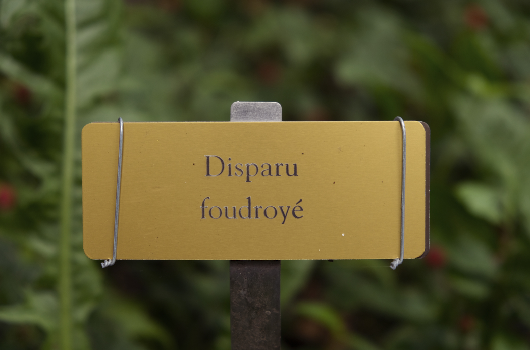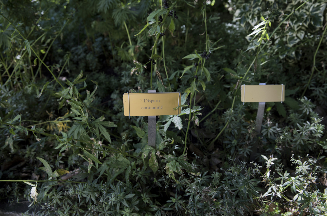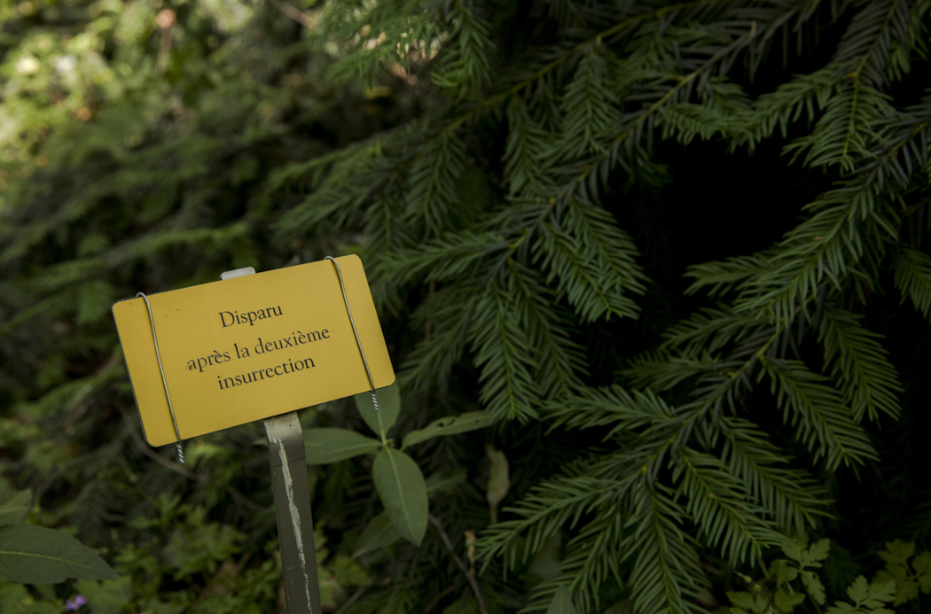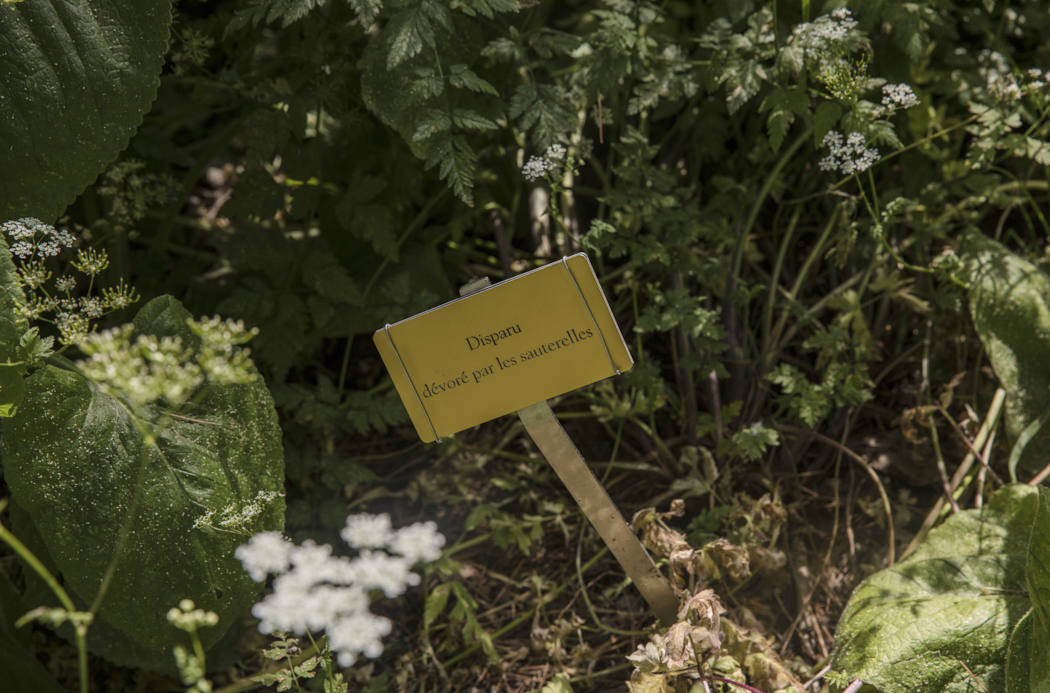 LA BEAUTÉ DU MONDE (The beauty of the world), an intervention on the labelling of the plants all over the botanical garden of the city of Meyrin. The installation tells a catastrophic story and heralds a tragic future. The labels covering the plates identifying the plants refer to the history of mankind and its cycles of destruction in an environmental, health and political context, which is devastated. Projected in a time when ignorance and loss of acquired knowledge is the norm, the visitor turns to the diversity and beauty of trees and plants, priceless gems that need to be protected.