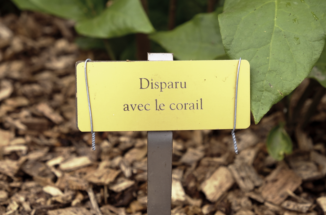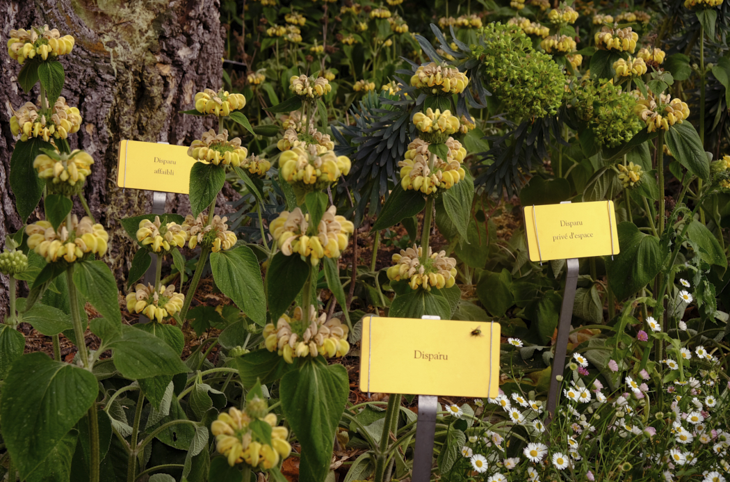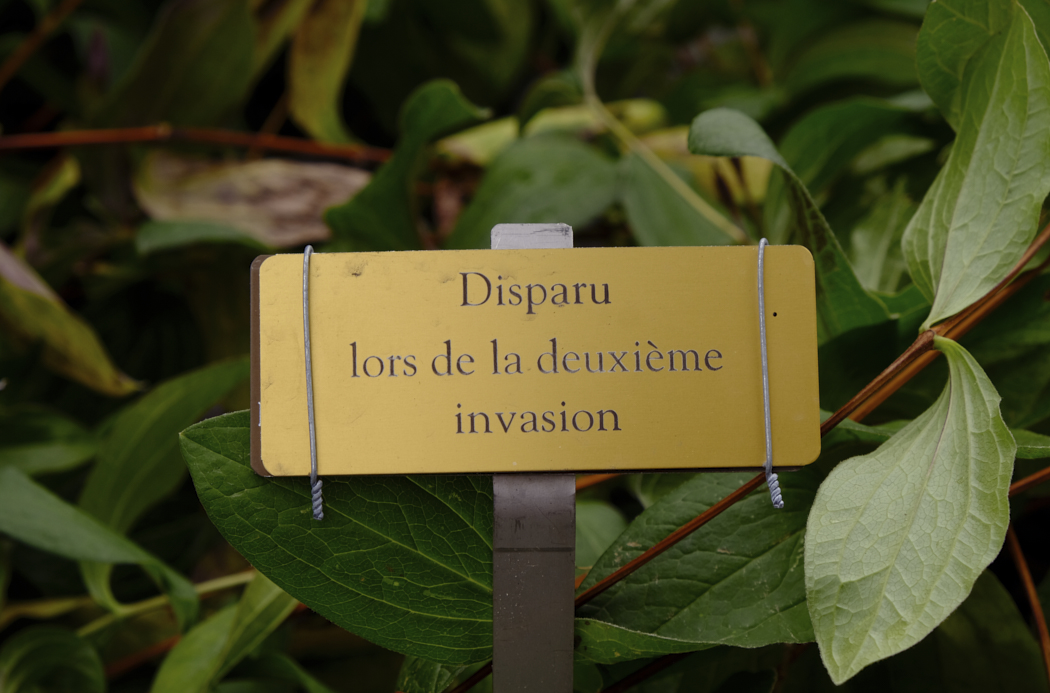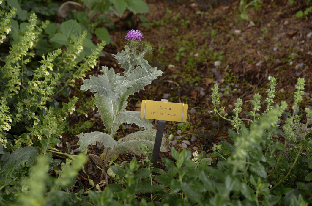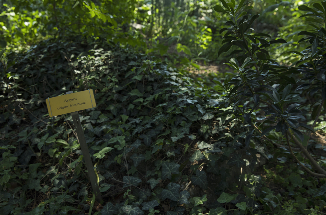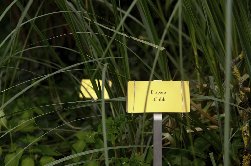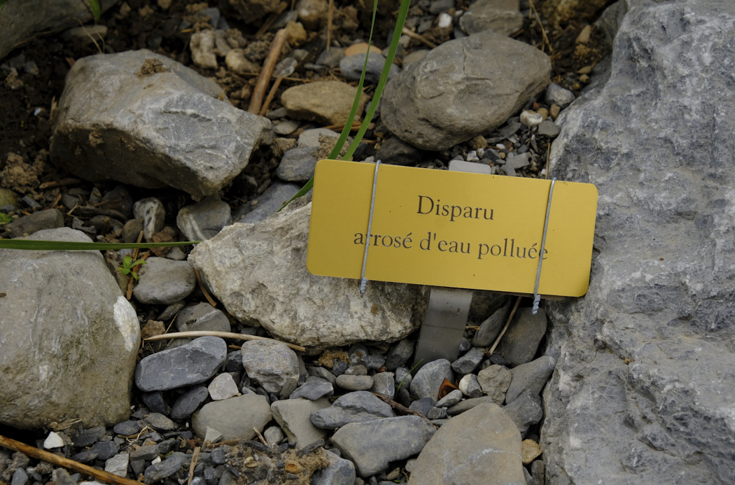 LA BEAUTÉ DU MONDE (The beauty of the world), an intervention on the labelling of the plants all over the botanical garden of the city of Meyrin. The installation tells a catastrophic story and heralds a tragic future. The labels covering the plates identifying the plants refer to the history of mankind and its cycles of destruction in an environmental, health and political context, which is devastated. Projected in a time when ignorance and loss of acquired knowledge is the norm, the visitor turns to the diversity and beauty of trees and plants, priceless gems that need to be protected.