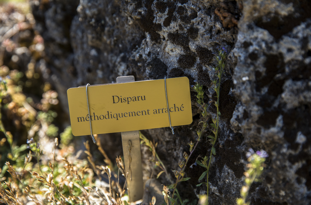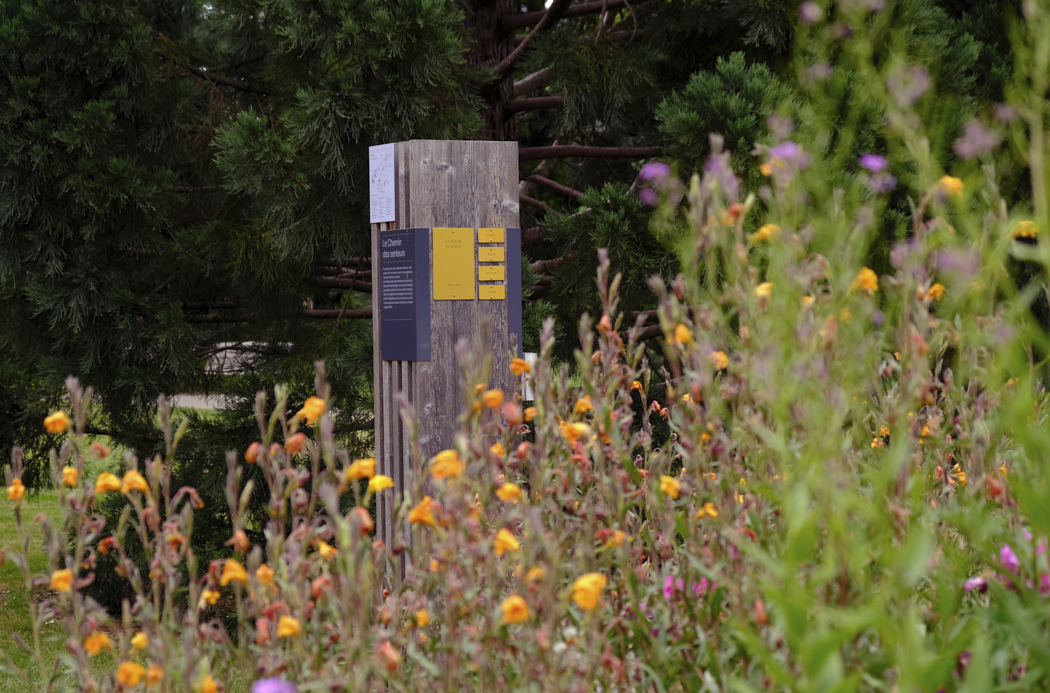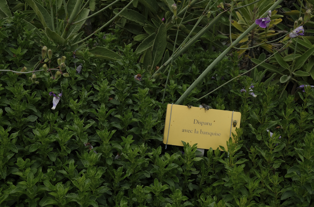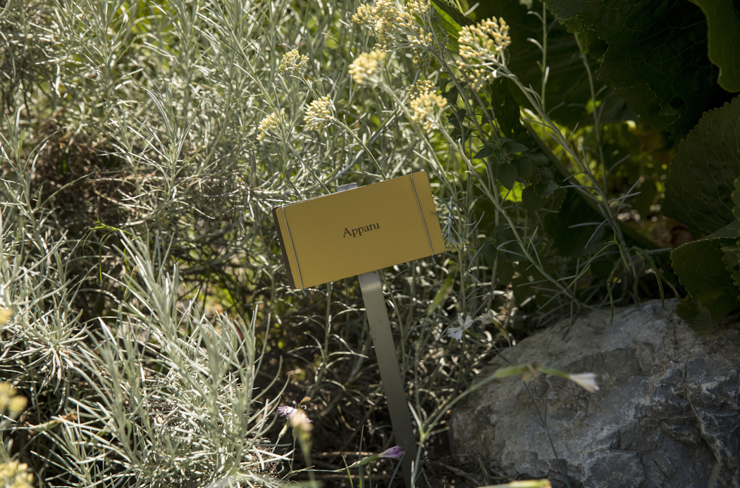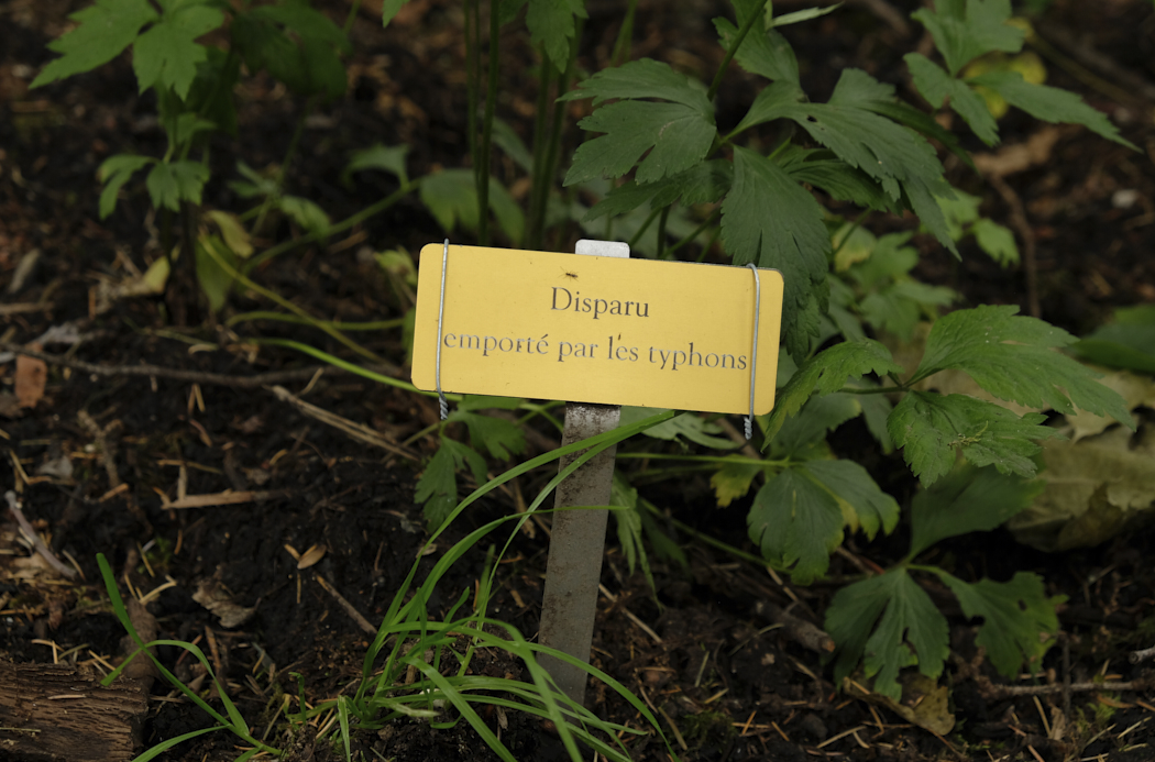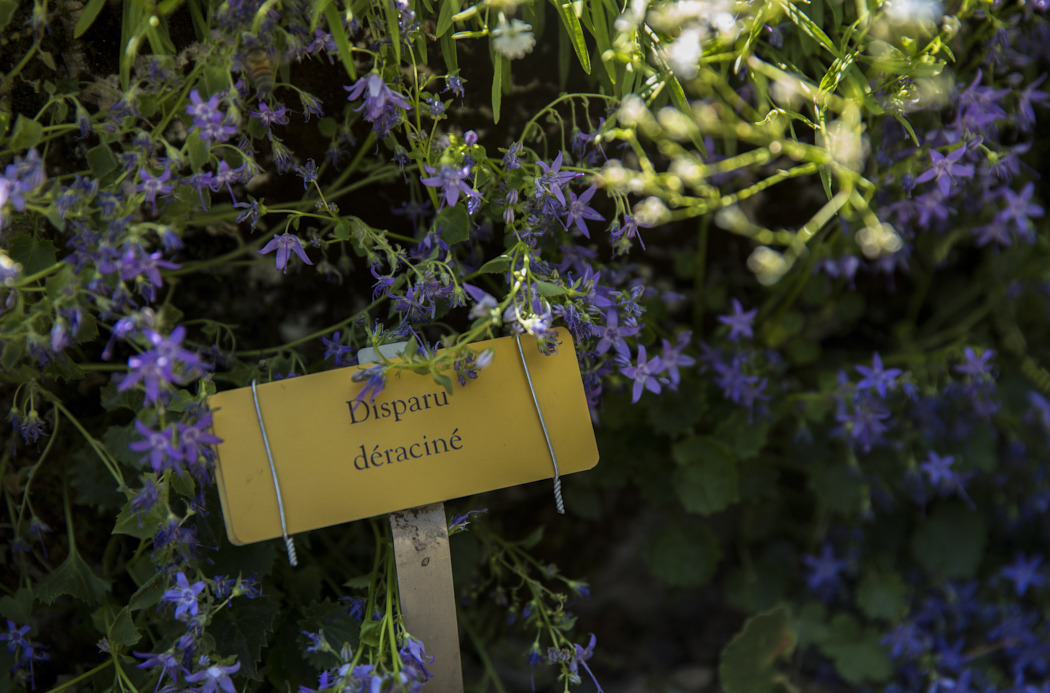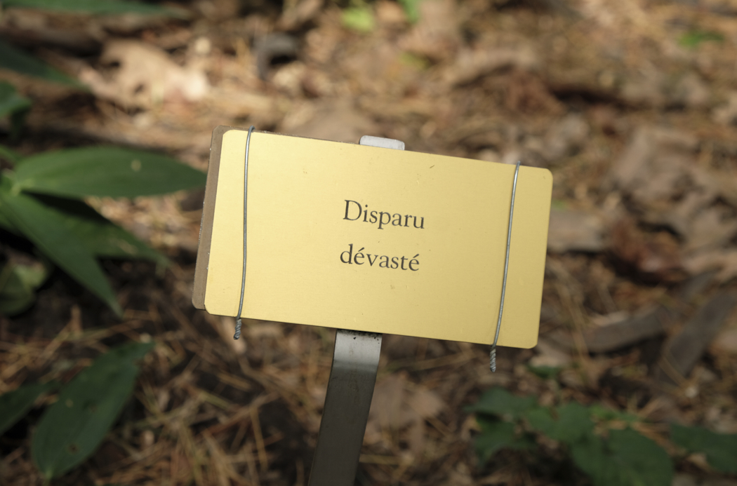 LA BEAUTÉ DU MONDE (The beauty of the world), an intervention on the labelling of the plants all over the botanical garden of the city of Meyrin. The installation tells a catastrophic story and heralds a tragic future. The labels covering the plates identifying the plants refer to the history of mankind and its cycles of destruction in an environmental, health and political context, which is devastated. Projected in a time when ignorance and loss of acquired knowledge is the norm, the visitor turns to the diversity and beauty of trees and plants, priceless gems that need to be protected.