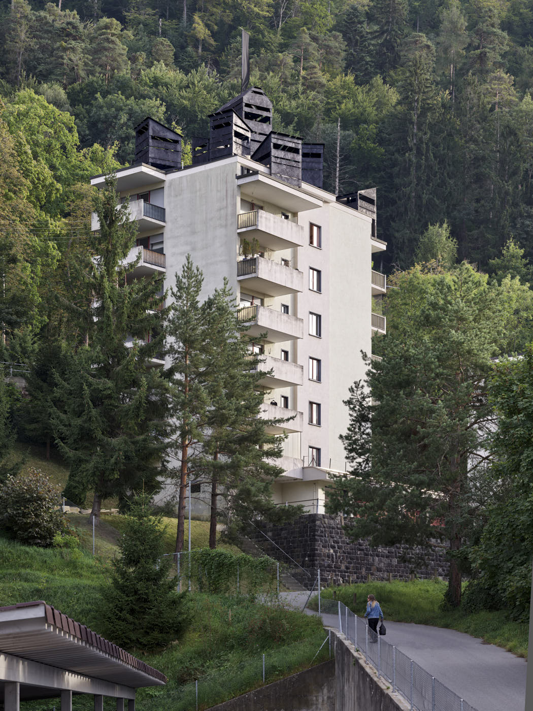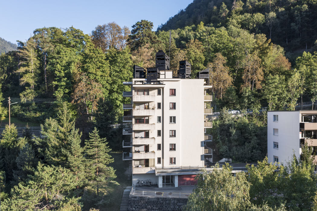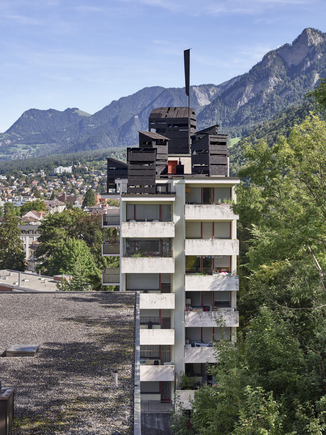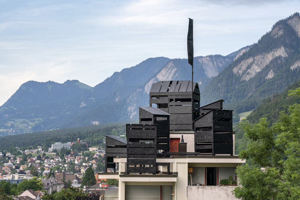 Was the space for this colony made available? Was it taken by force? Are its occupants welcomed or held captive? Is the enemy threatening us at our doorstep, or are we showing them our strength? The banners hang over the city. HORST raises questions about hospitality and the need to take up space. Eight wooden huts covered with tar are built on the roof of a residential building in Chur. They are visible from the road, the surrounding hills and the city below. Flags flutter in the wind. HORST is a state, an occupation.
