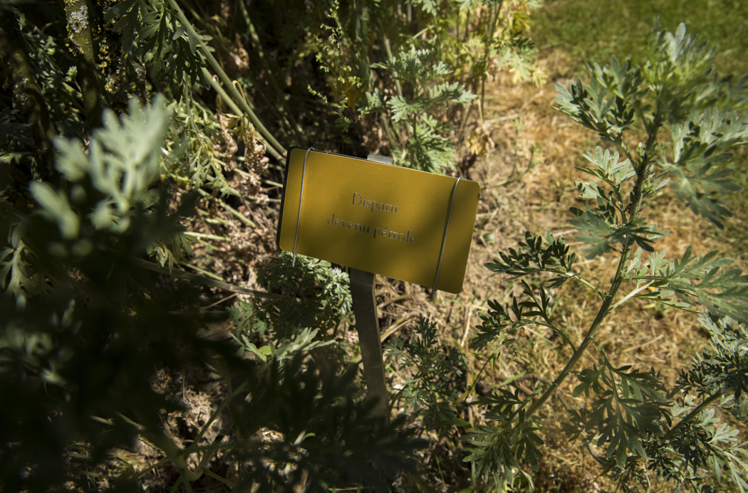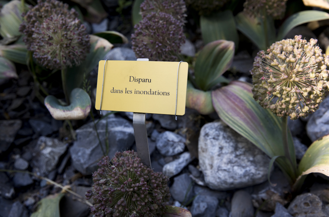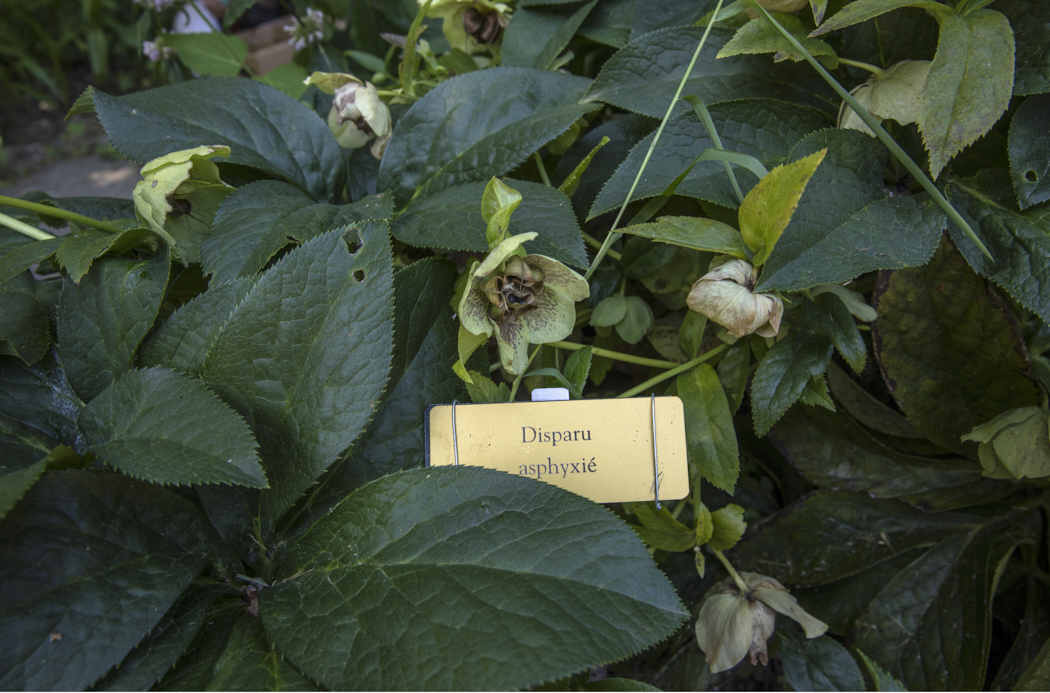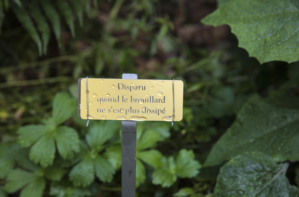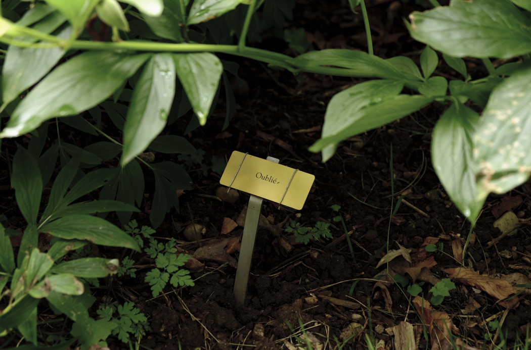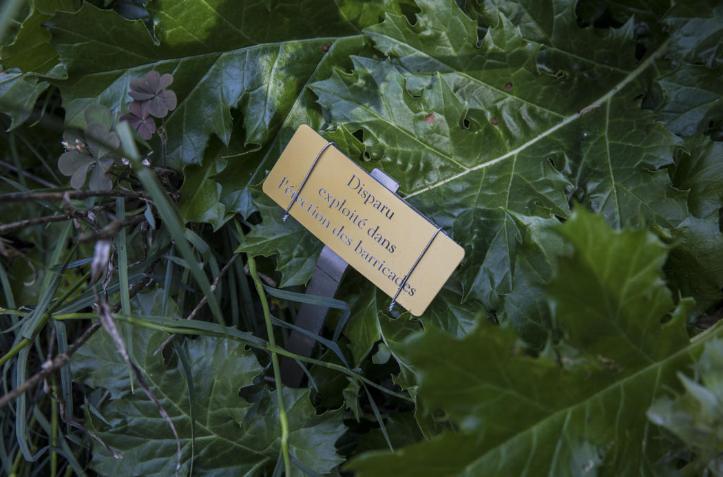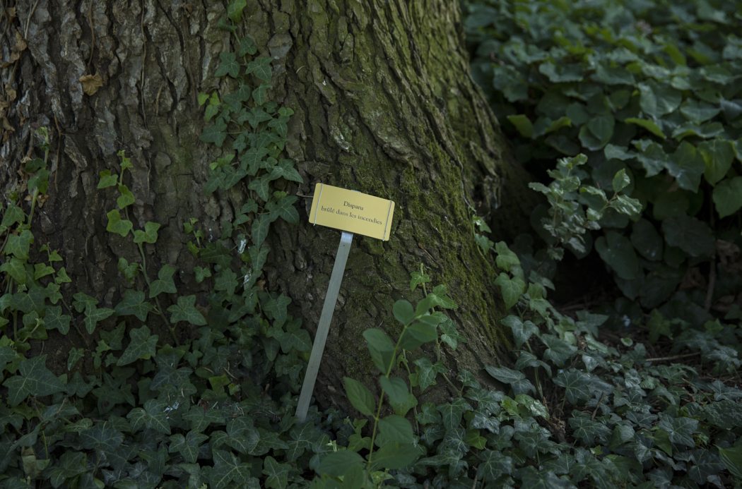 LA BEAUTÉ DU MONDE (The beauty of the world), an intervention on the labelling of the plants all over the botanical garden of the city of Meyrin. The installation tells a catastrophic story and heralds a tragic future. The labels covering the plates identifying the plants refer to the history of mankind and its cycles of destruction in an environmental, health and political context, which is devastated. Projected in a time when ignorance and loss of acquired knowledge is the norm, the visitor turns to the diversity and beauty of trees and plants, priceless gems that need to be protected.