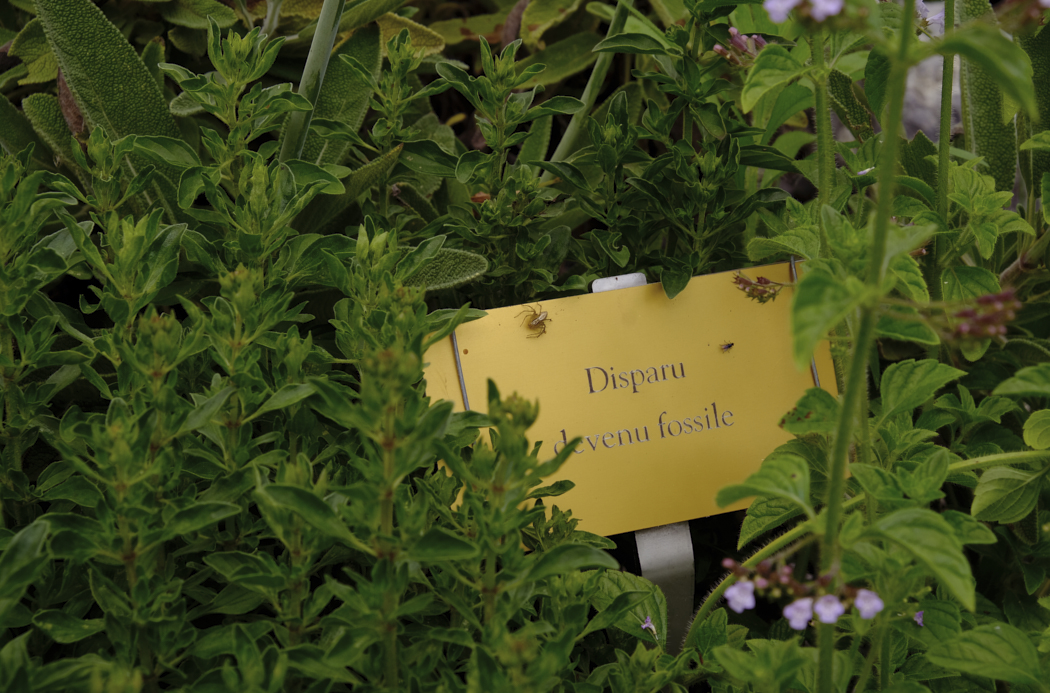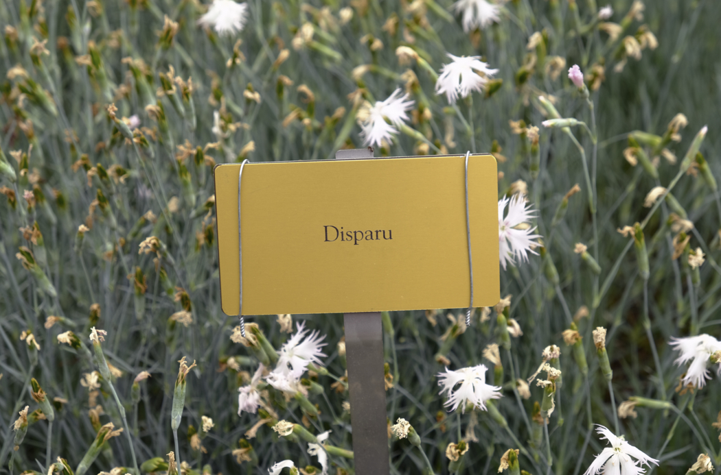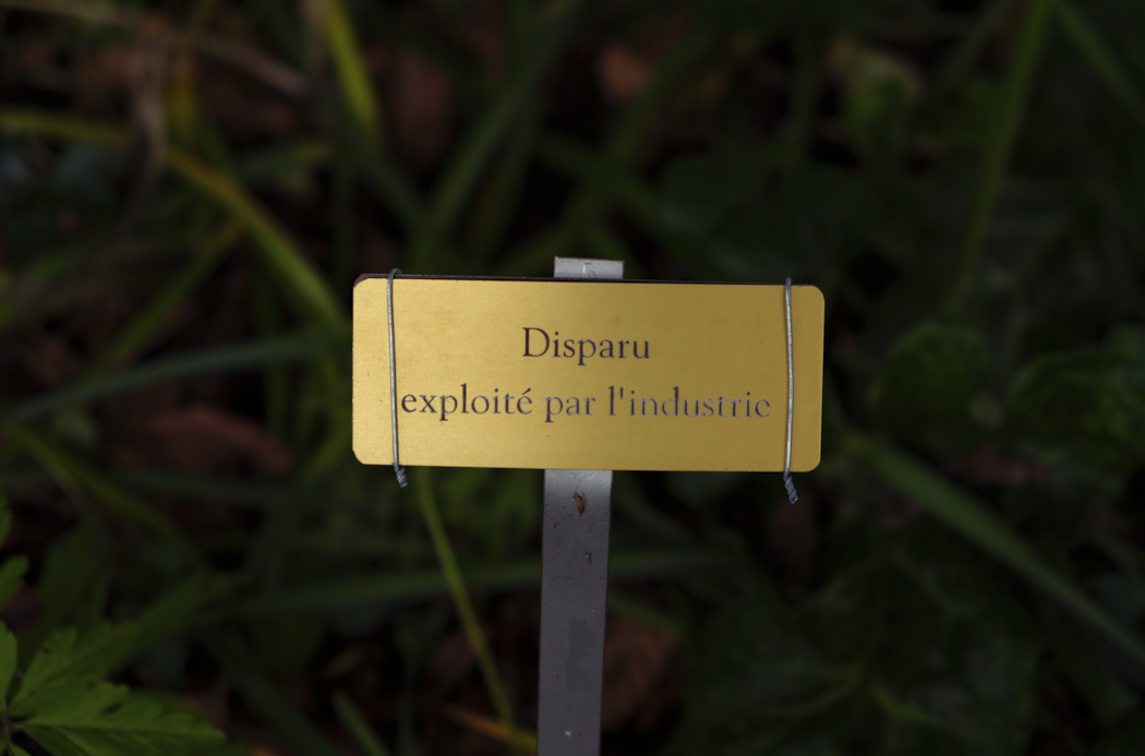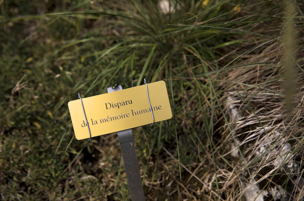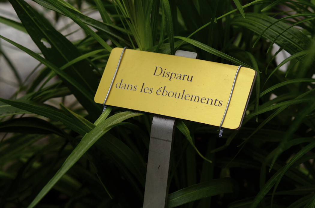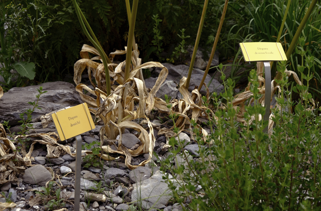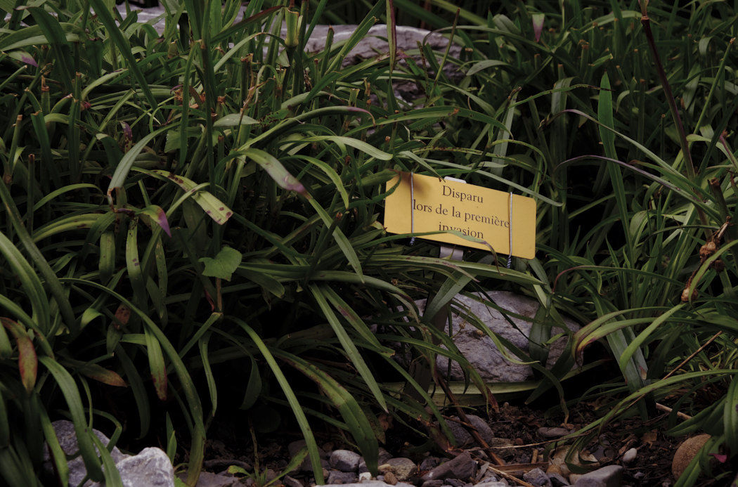 LA BEAUTÉ DU MONDE (The beauty of the world), an intervention on the labelling of the plants all over the botanical garden of the city of Meyrin. The installation tells a catastrophic story and heralds a tragic future. The labels covering the plates identifying the plants refer to the history of mankind and its cycles of destruction in an environmental, health and political context, which is devastated. Projected in a time when ignorance and loss of acquired knowledge is the norm, the visitor turns to the diversity and beauty of trees and plants, priceless gems that need to be protected.