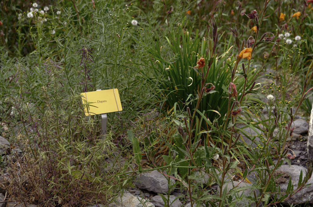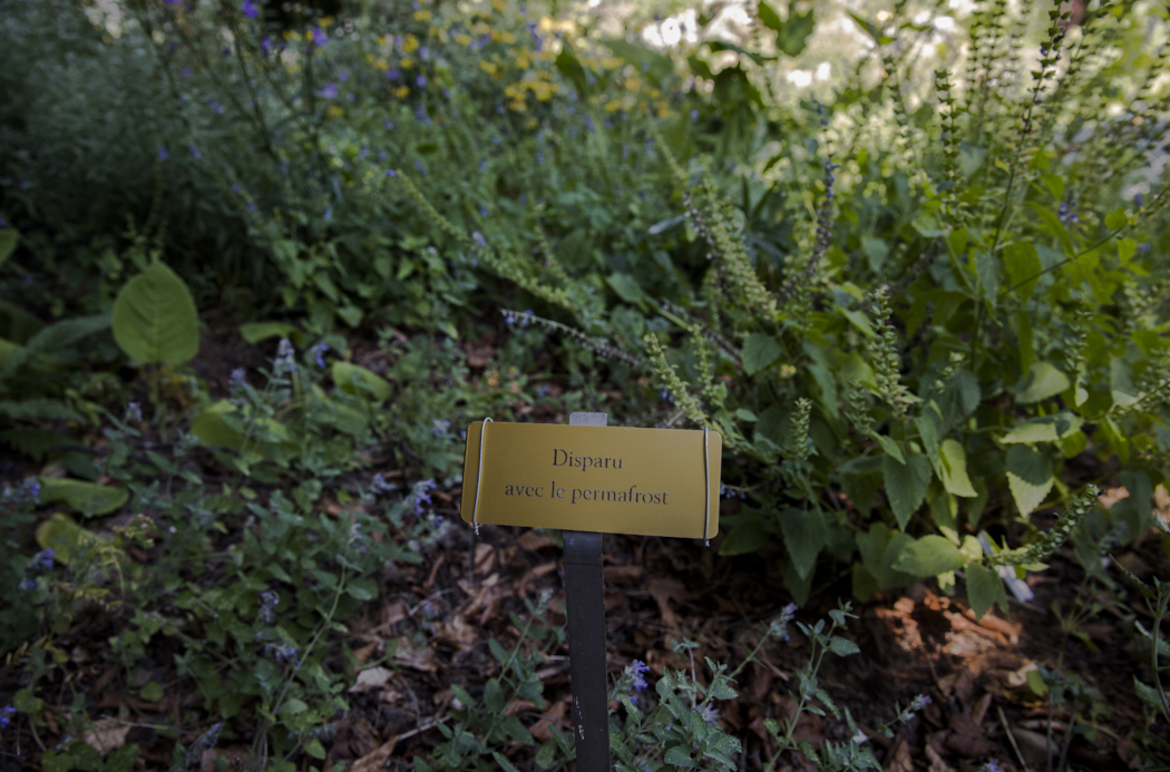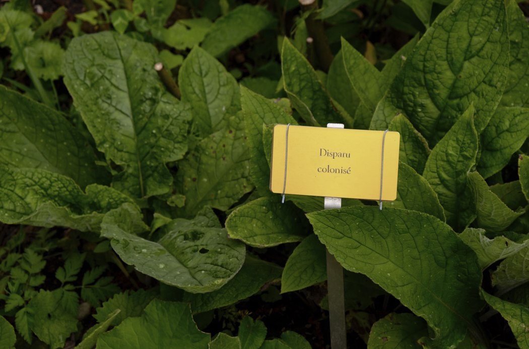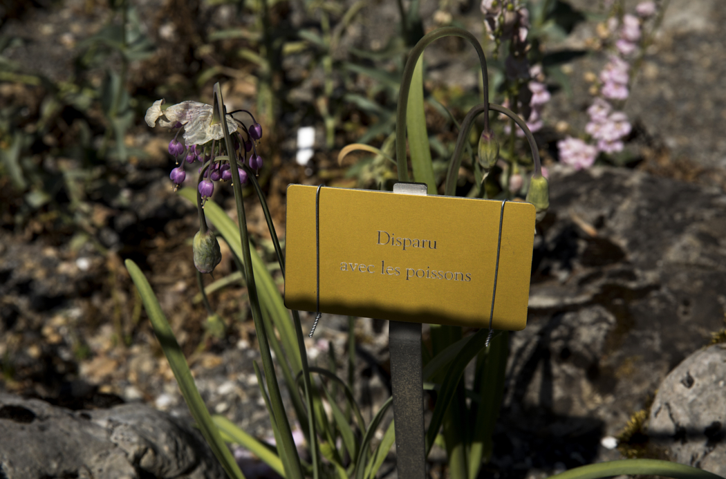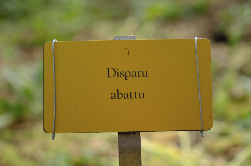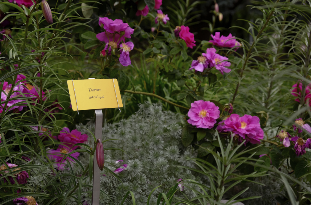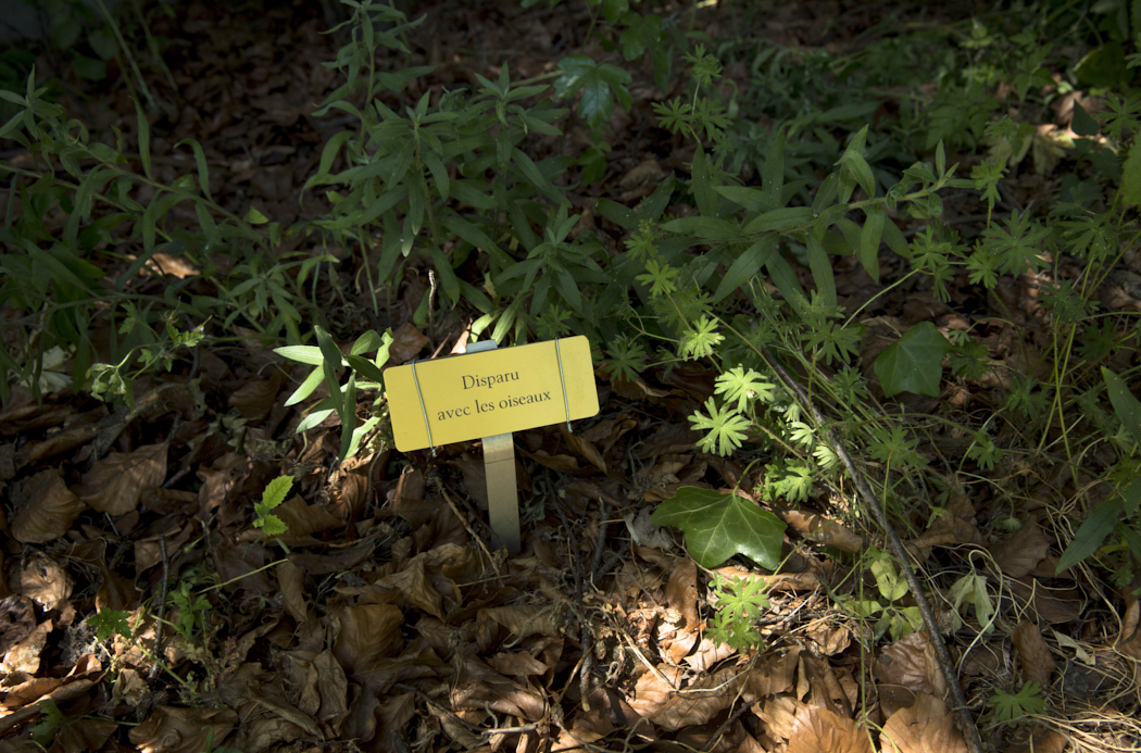 LA BEAUTÉ DU MONDE (The beauty of the world), an intervention on the labelling of the plants all over the botanical garden of the city of Meyrin. The installation tells a catastrophic story and heralds a tragic future. The labels covering the plates identifying the plants refer to the history of mankind and its cycles of destruction in an environmental, health and political context, which is devastated. Projected in a time when ignorance and loss of acquired knowledge is the norm, the visitor turns to the diversity and beauty of trees and plants, priceless gems that need to be protected.